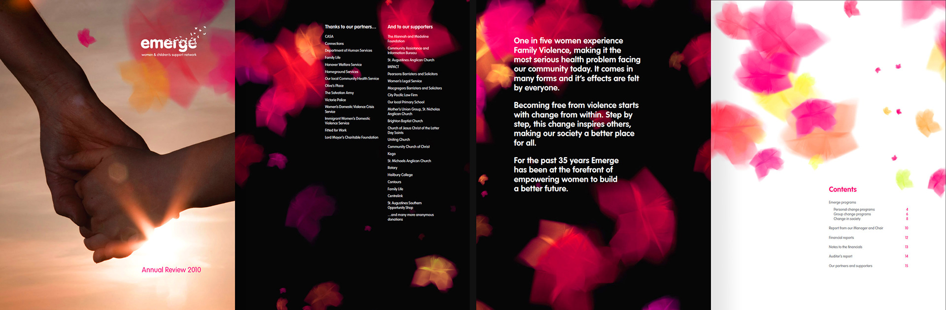 Emerge is a not-for-profit organisation who run a shelter as well as workshops for women and children affected by domestic violence. With a very tight budget we did all of the creative ourselves including the photography and copy writing.